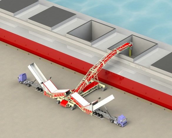 散料裝車機采用新技術(shù),極大地提高工作效率,降低勞動強度,減少貨物損傷,縮短車船、碼頭的裝卸時間,是企業(yè)降低生產(chǎn)成本,提高效率和產(chǎn)品質(zhì)量的有效設(shè)備??梢园迅劭冢旱V,砂石礦和物流中心,大型散貨存放地的散裝物料直接輸送到傳輸帶上并輸送到大型卡車上,裝車效率高,速度快,每小時可以裝料800噸以上。工作動力采用柴油機,行走為液壓馬達行走。履帶行走使用不同的復(fù)雜路況,移動快捷,方便。液壓先導(dǎo)操作簡單,靈活。